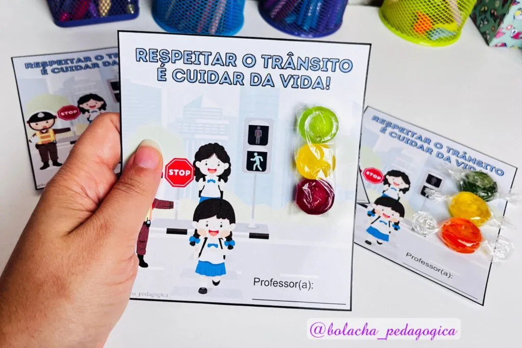 Para deixar esse aprendizado ainda mais especial, disponibilizamos um cartão temático de trânsito para download gratuito. O cartão é decorado com as cores do semáforo (verde, amarelo e vermelho) e pode ser usado para entregar lembrancinhas, guloseimas ou materiais educativos sobre o trânsito.