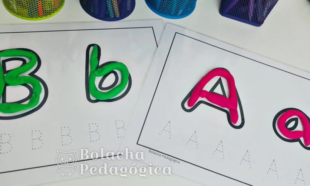 Uma das formas mais eficazes de apresentar o alfabeto é o uso de atividades táteis, como cobrir letras com massinha de modelar. Essa proposta ajuda no reconhecimento visual das letras, no desenvolvimento da coordenação motora fina e no vínculo entre o som e o símbolo gráfico.
