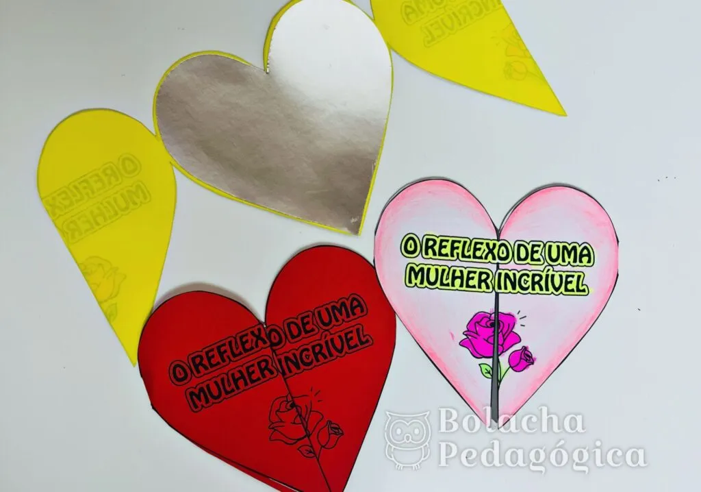 Para facilitar essa atividade especial, disponibilizamos gratuitamente um modelo de cartão em formato de coração com papel espelhado para as crianças confeccionarem e presentearem uma mulher especial.
