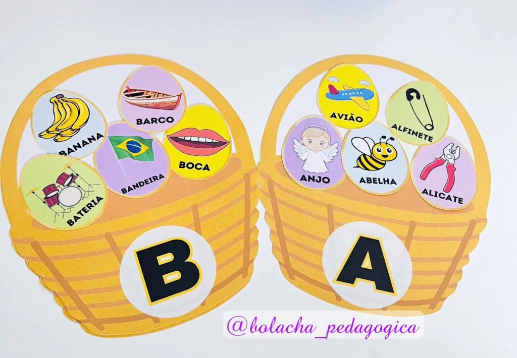 A proposta do arquivo é parear as imagens, colocando os ovinhos em seus respectivos cestos.