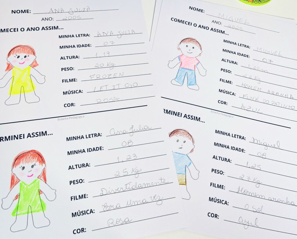 Uma forma divertida e significativa de acompanhar esse crescimento é com uma atividade de registro pessoal, onde a criança pode desenhar, escrever e comparar aspectos de si mesma no início e no final do ano.