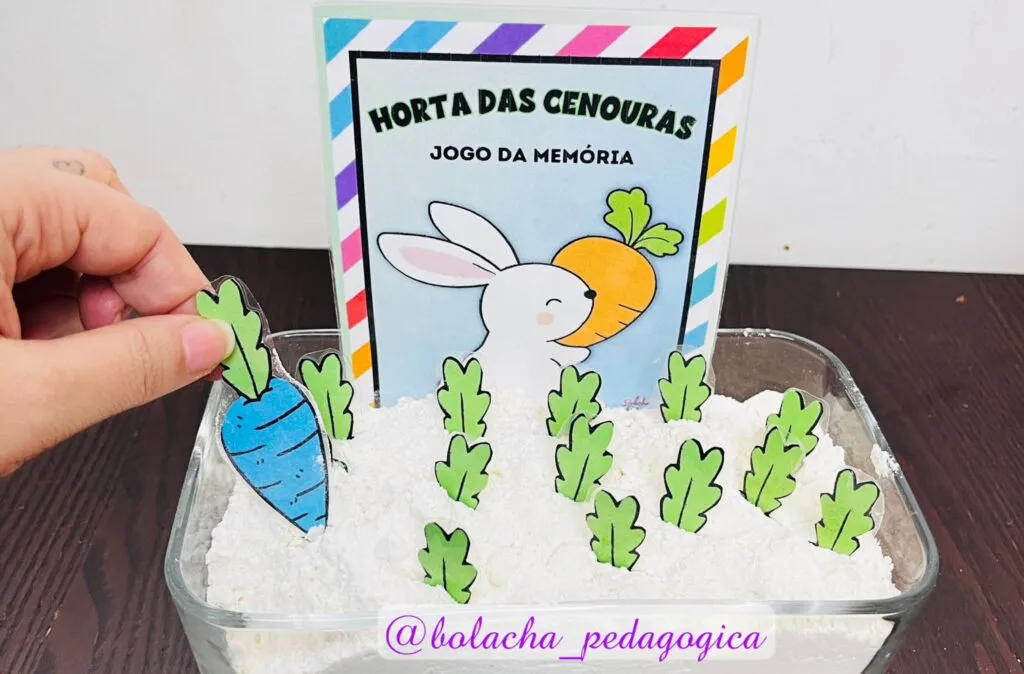 • Funciona como um jogo da memória normal, mas ao invés de virar para baixo, retira a cenoura e enfia novamente. Ganha quem fizer mais parzinhos.