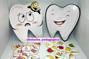 Esse joguinho é para as crianças fazerem um pareamento dos alimentos saudáveis e não saudáveis com os dentes. Trabalha tanto alimentação saudável quanto higiene bucal.