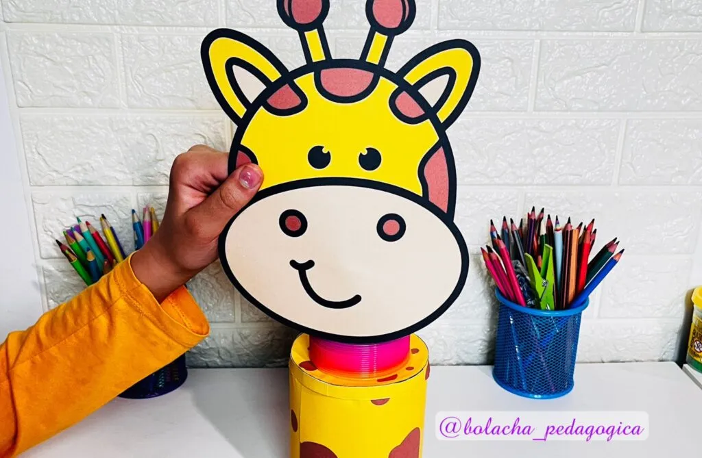 Bem fácil de montar, o recurso tem um rótulo para lata, no tamanho de uma lata de achocolatado de 400 gr. E a cabeça da girafa.
