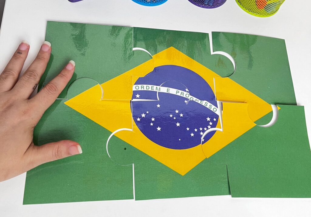 Montagem do Quebra-Cabeça: Disponibilize o quebra-cabeça da bandeira do Brasil para que as crianças possam montar. Deixe que elas explorem as peças e tentem encaixar as partes da bandeira. Essa atividade pode ser feita individualmente ou em grupo, estimulando a cooperação e o trabalho em equipe.