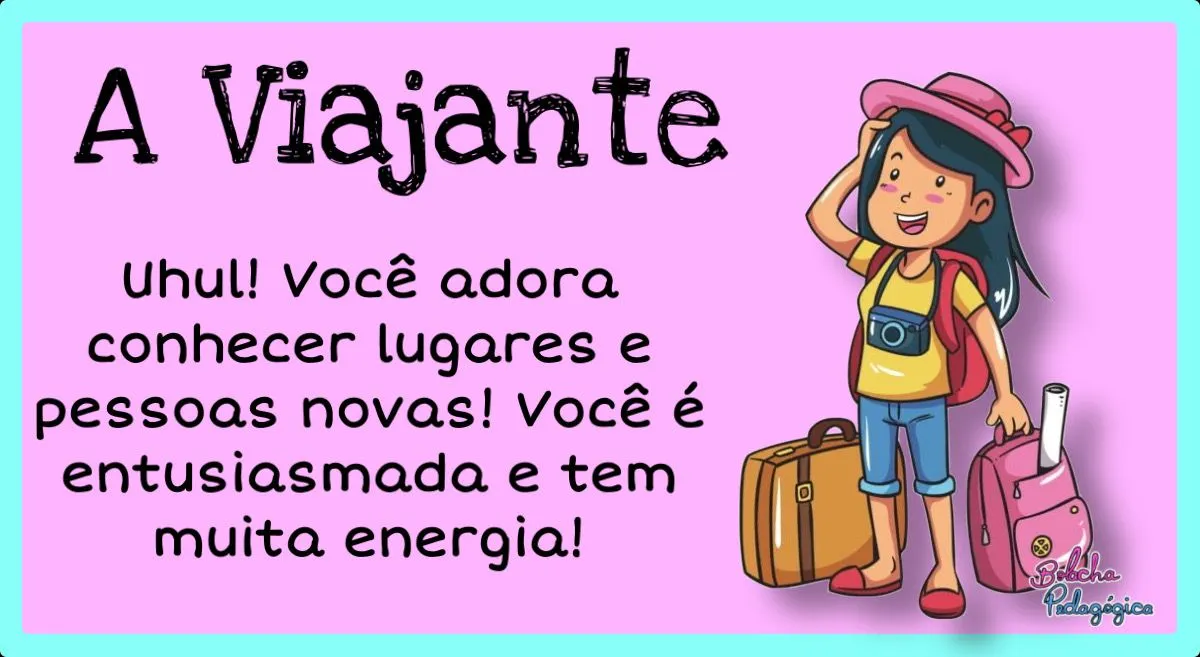 Uhul! Você adora conhecer lugares e pessoas novas! Você é entusiasmada e tem muita energia!